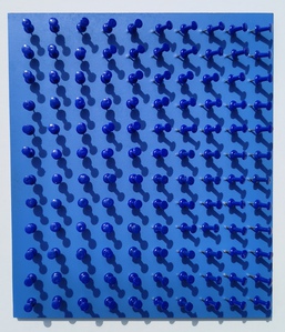 2020Dit werk behoort tot de 'Pushpin _serie', een reeks van optische werken. Door het gebruik van pushpins wordt een prachtig optisch effect bereikt door de weerspiegeling van het materiaal en het effect van licht en schaduw. De nieuwe reeks pushpins zijn werken met als inspiratie dahlia's.